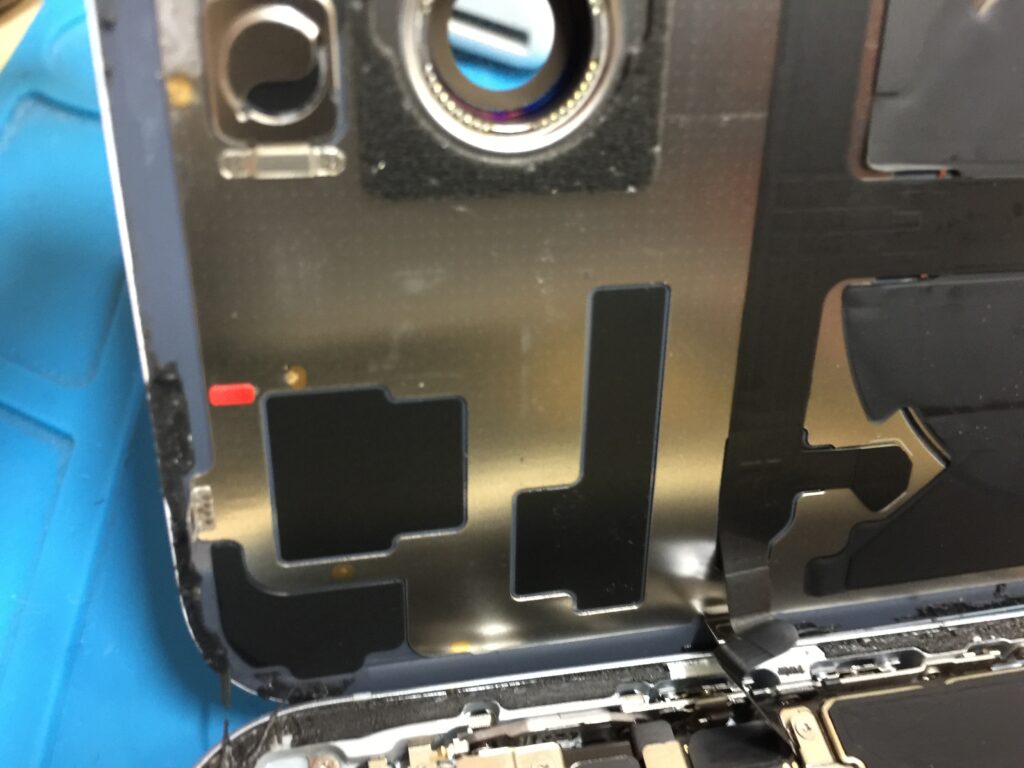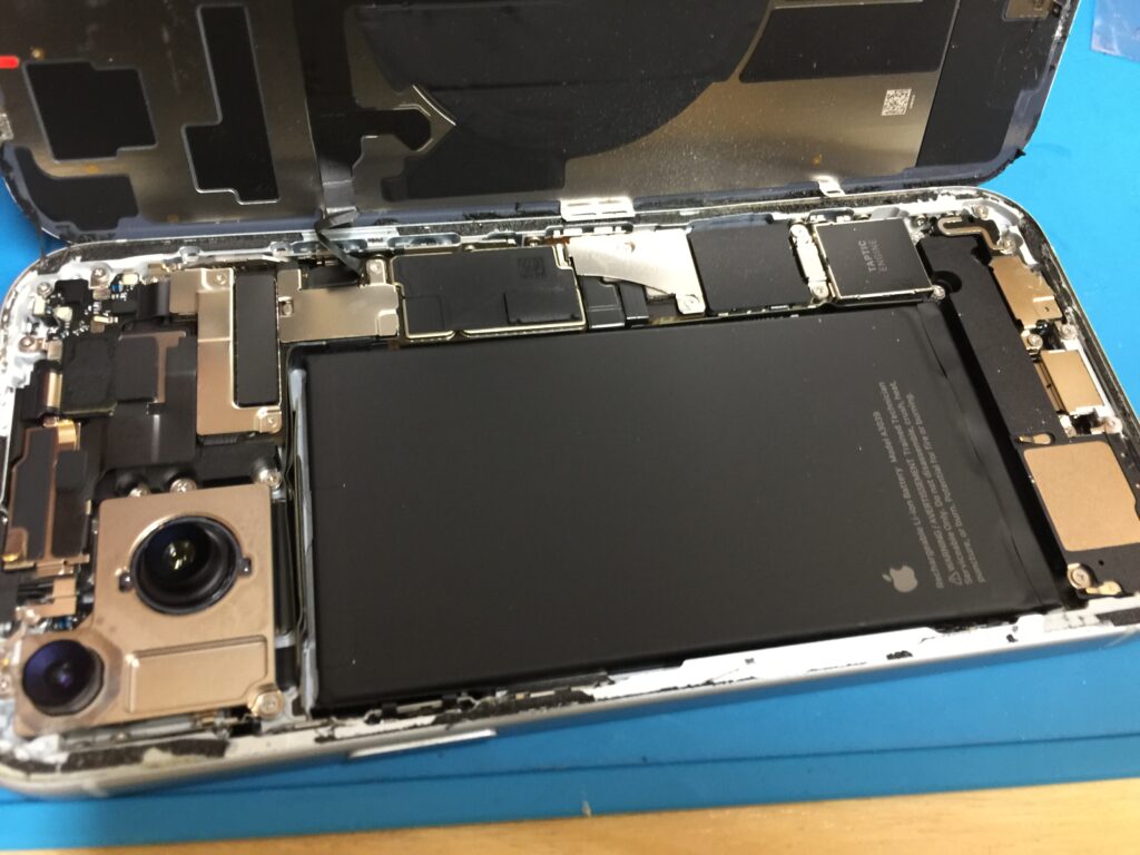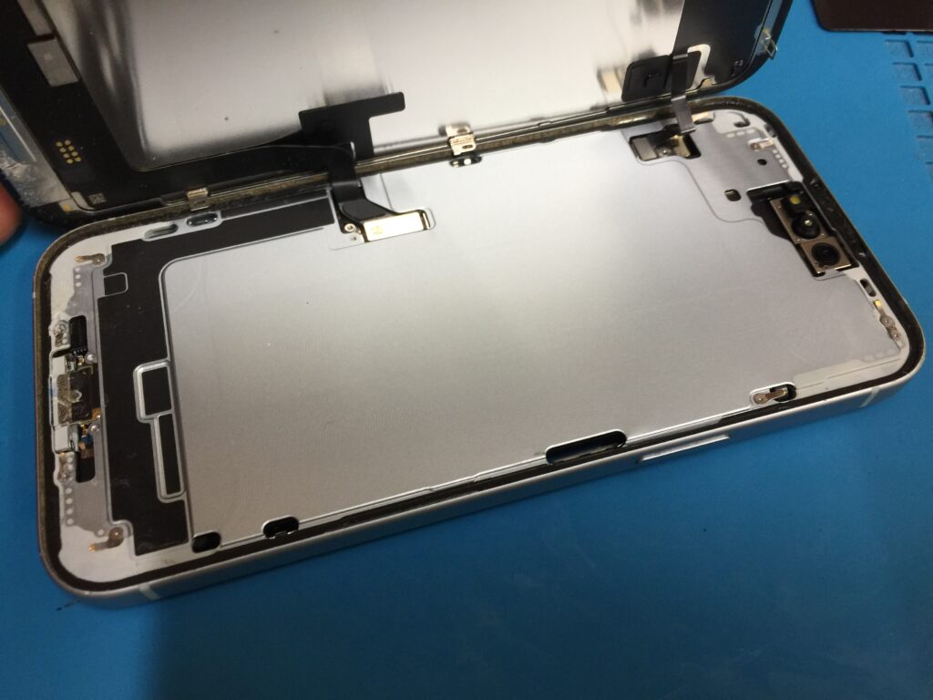 iPhone15プラスは背面のバックパネルを取り外すと基板やバッテリーがあります。
